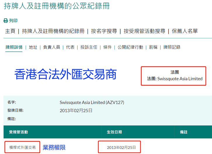 ※如果搜尋不到券商,可用中央編號再搜尋一次,比如Swissquote Asia Limited的中央編號為# AZV127,輸入AZV127的6位數搜尋即可!瑞讯Swissquote(香港)注册信息
