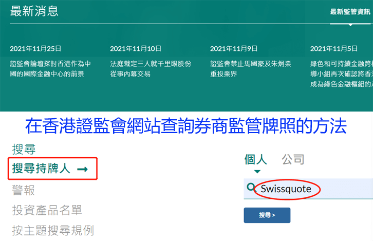 第二步:在頁面右側找到“搜尋持牌人”,如果你想要搜索經紀商名稱的話就選擇“公司”,這里以“Swissquote”為例,輸入公司名稱,點擊搜尋。