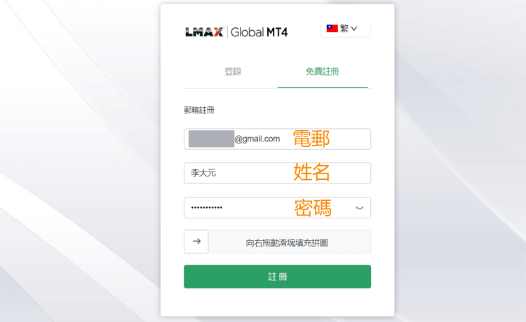 2.輸入電郵、姓名、登錄密碼,根據提示用向右拖動滑塊填充拼圖,通過人機驗證即可完成LMAX的MT4賬號註冊。