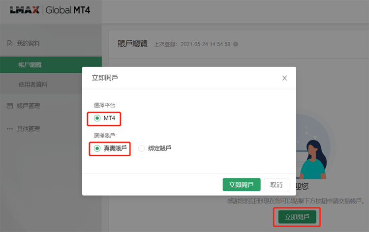 在MT4後台選擇MT4的“真實賬戶”開戶。