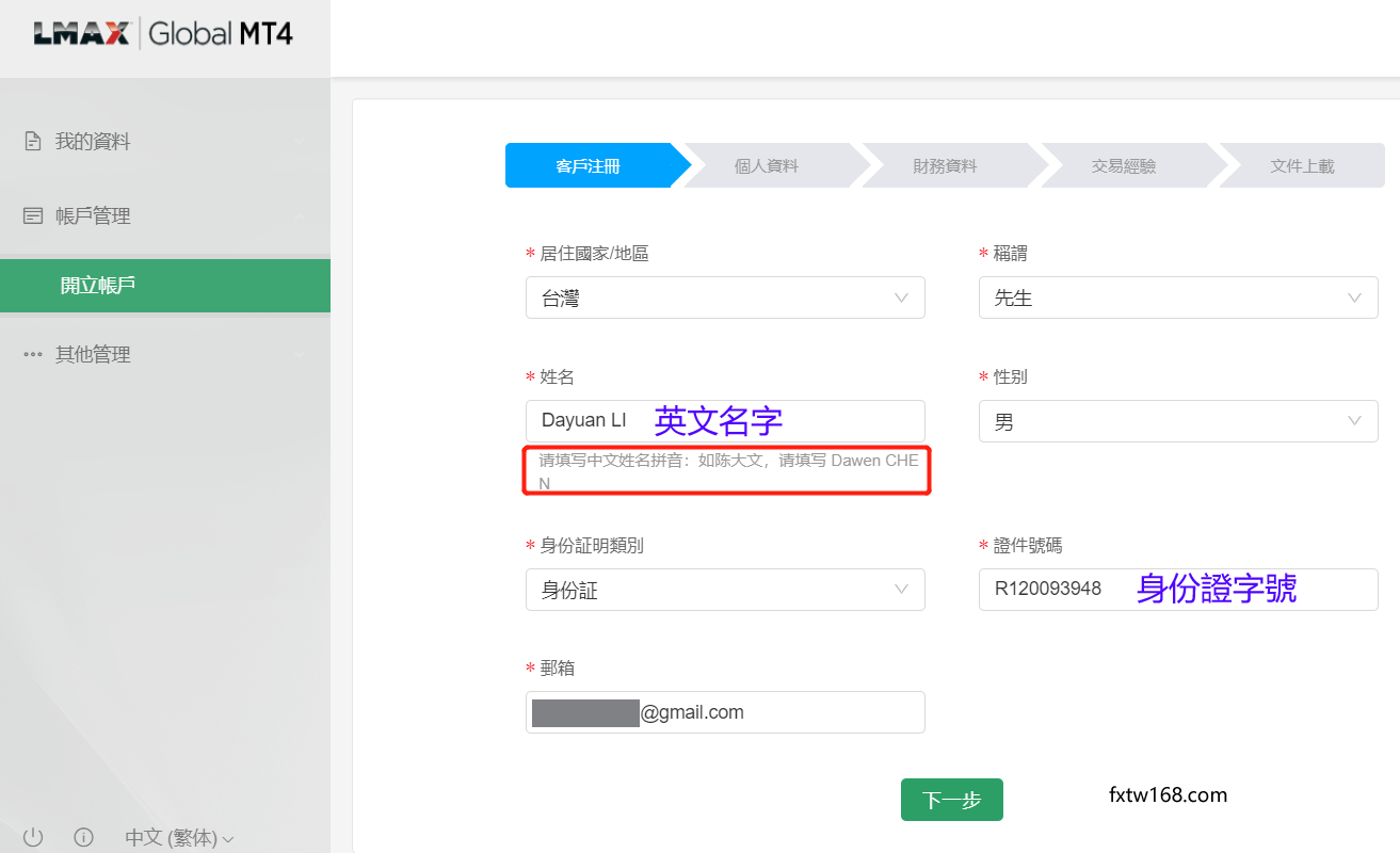 填寫國家/地區(台灣)、姓名(需要用英文名字)、身份證字號和聯絡電郵等個人資料!