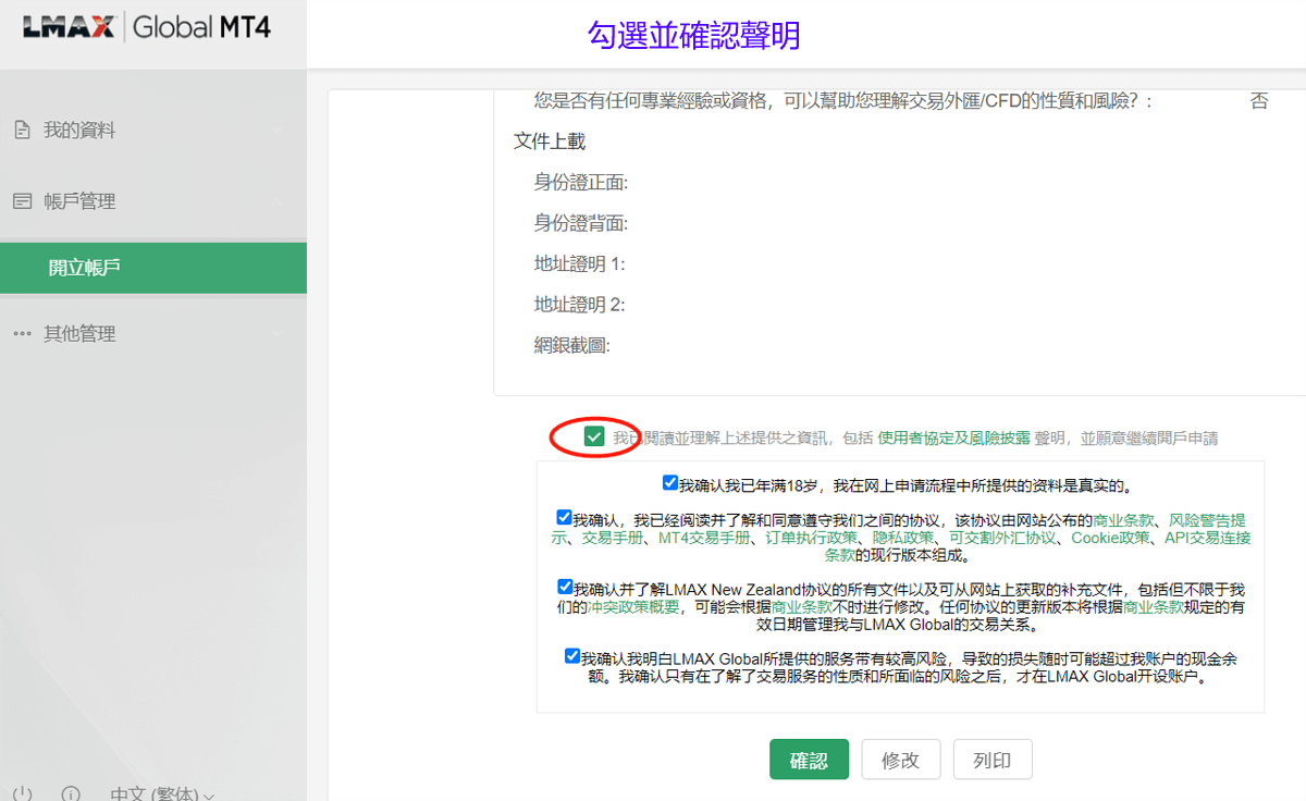 最後,勾選並確認「風險披露」、「開戶協議」等,表示你已經充分了解其中的風險,並遵守交易協議。